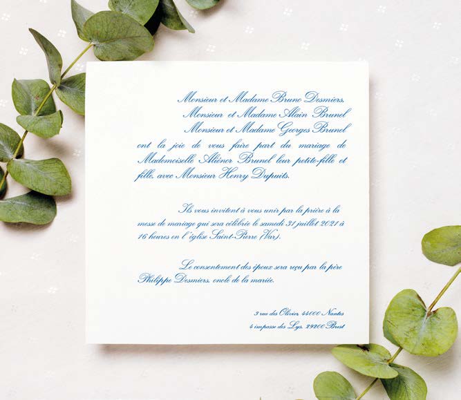 Avant l’impression, un BAT (bon à tirer) vous sera envoyé pour validation du contenu et de la mise en page. Vos faire-part seront livrés pliés, prêts à être envoyés à vos proches.